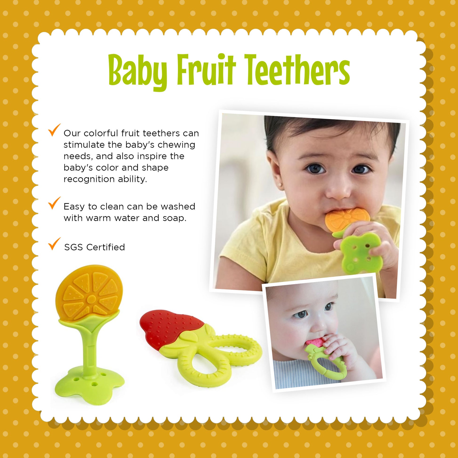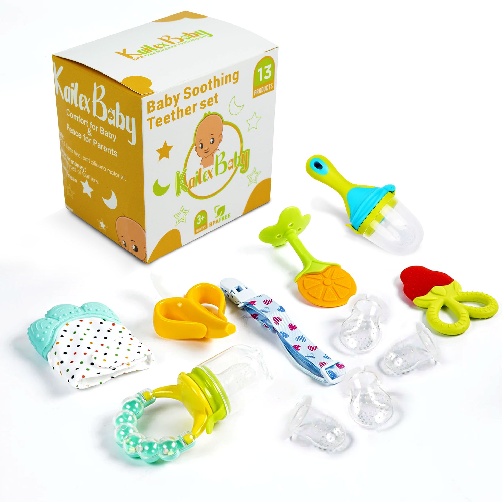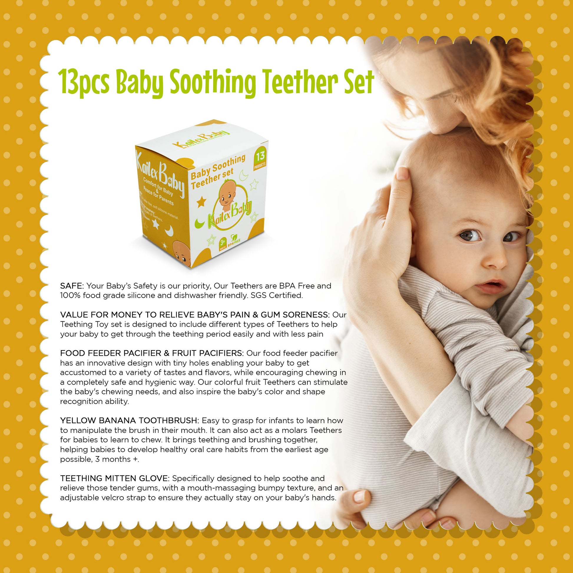 - COMPLETE BABY TEETHER SET -13pcs Ensure the comfort and safety of your little one's sensitive gums with these teether toys. Each pack has various types of teethers to help babies get through this challenging phase with less pain. 2 baby fruit feeders, 2 food feeder pacifier with 6 silicon sacs, 1 banana toothbrush, 1 teething mitten, 1 pacifier clip