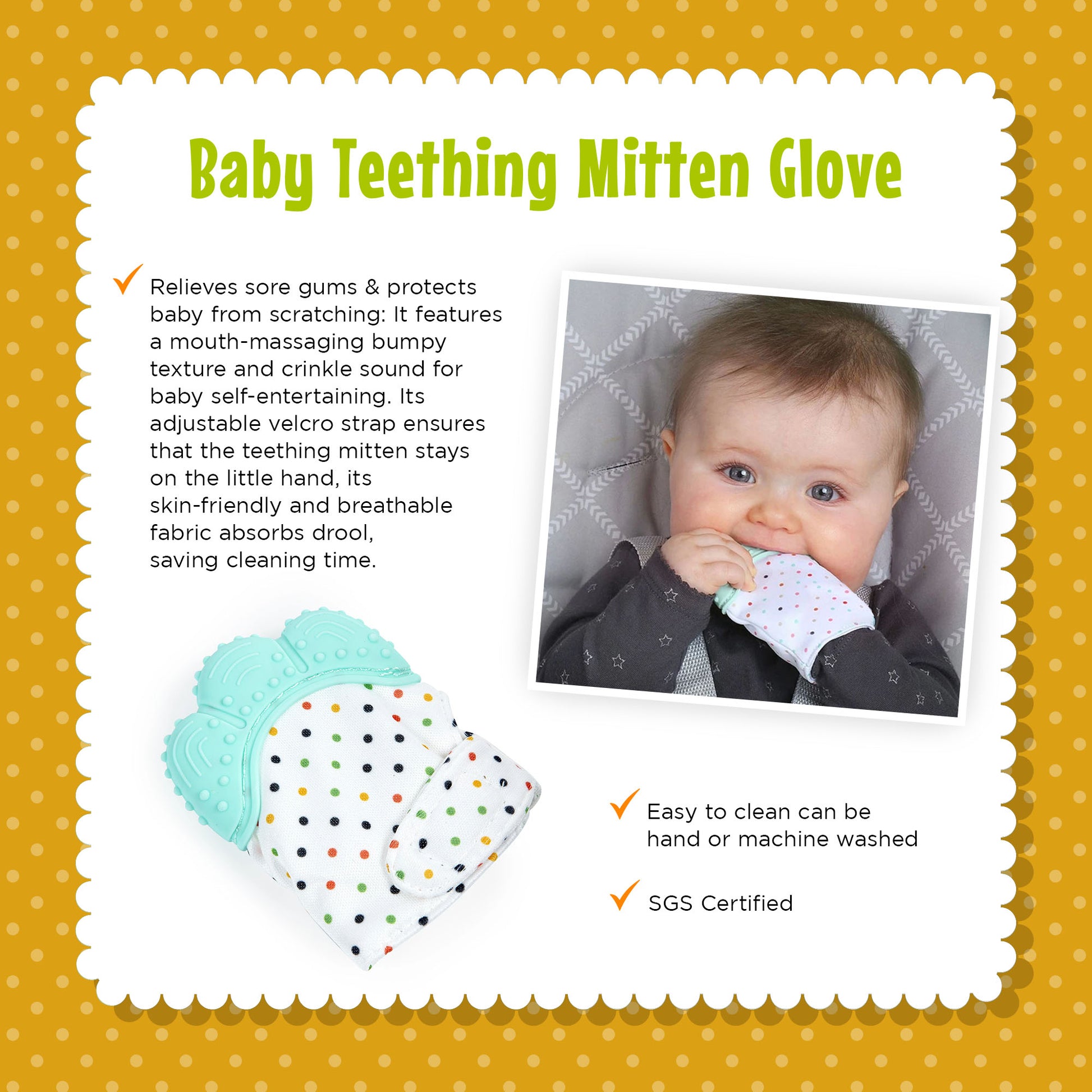 - GENTLE ON BABY'S GUM- A slip-on teether toy, our mitten glove has a bumpy texture for massaging and soothing sensitive gums. It also has an adjustable strap that keeps it in place.